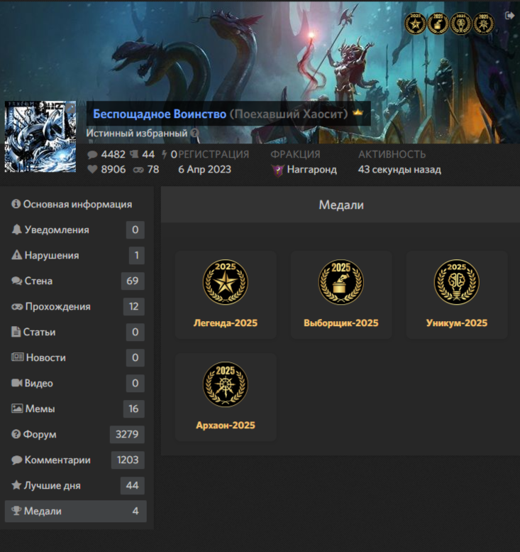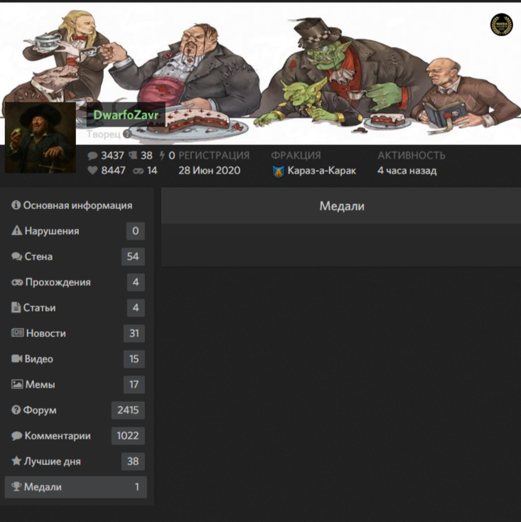 А вот, например, в профиле Дварфозавра, у которого тоже 4 медали, на вкладке я не вижу ни одной, а сверху в ряду по-прежнему висит старая заглушка: