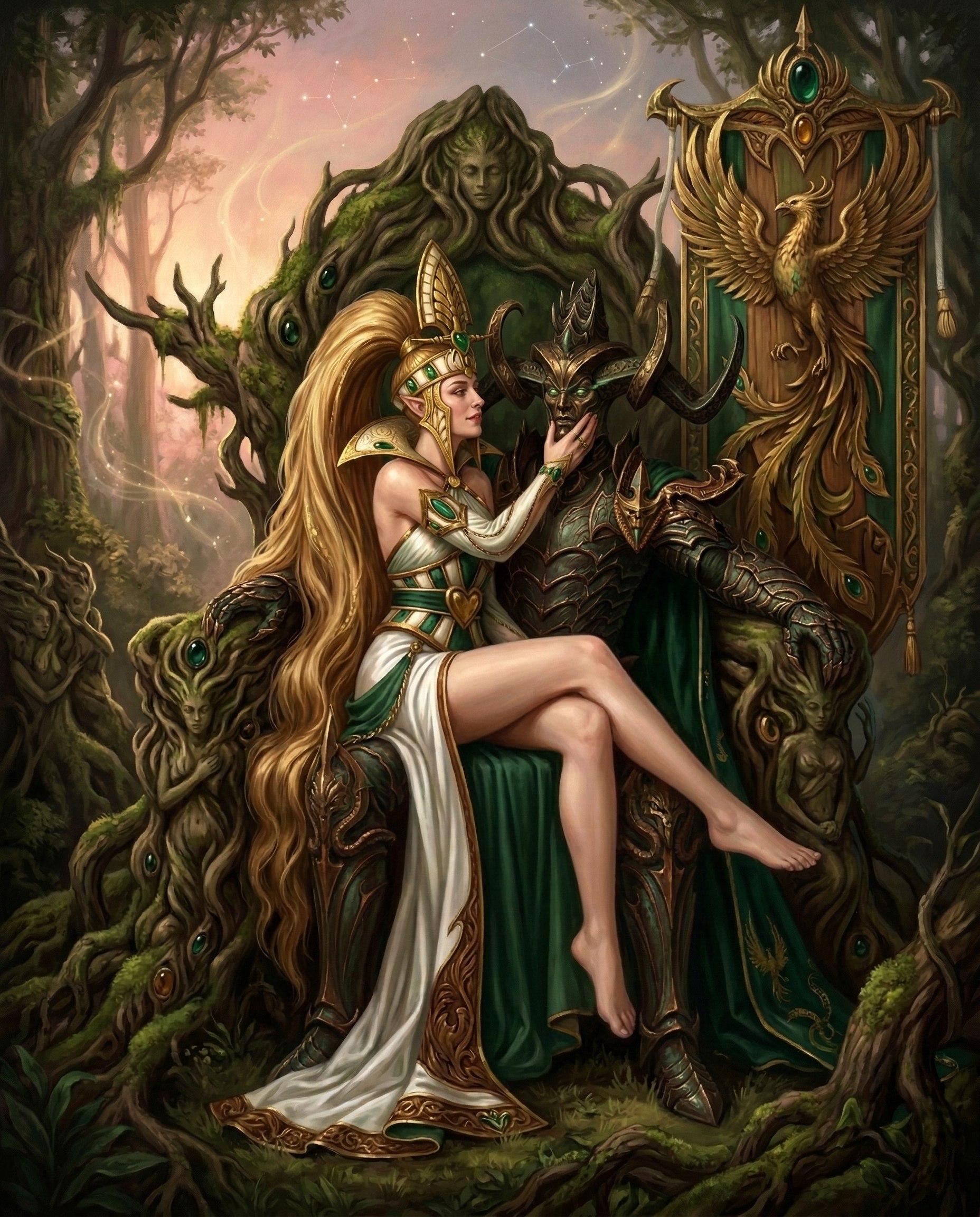 Трон, перед которым пара стояла, был выращен. Не выточен искусной рукой, не отлит в металле, как принято было у друхиев, не слеплен в глине и мраморе — как заведено среди перворожденных асур. Живой, немеркнущий, переливающийся оттенками малахита и бирюзы, он жил своей жизнью: плавно тянулись в стороны ростки, завивались бутоны аканта, неслись волны грезящей пыльцы. На троне сидел эльф, которого помнил и не узнавал Альберик.