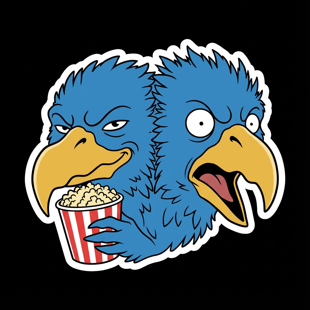 голова, смотрящая в прошлое, на расслабоне, как в кинотеатре (попкорн можно пририсовать, если получится), а вторая, направленная в будущее, максимально напряжена в стиле «видела некоторое дерьмо» Avallon