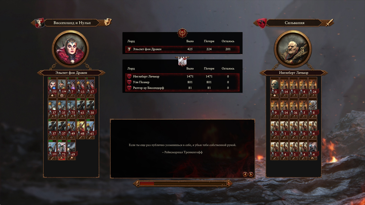 При серьезном численном перевесе противника, враг потерял всех военачальников – Эльспет уничтожила их лично, что стало тривиальной задачей для волшебницы на драконе, затем в ход пошли стрелки и артиллерия, но враг быстро задавил пехоту и снес стрелков. Остатки наиболее самоотверженных стрелковых отделений – маленькие группы пистольеров и арбалетчиков – применили тактику перестрелки, пользуясь маневренностью против медлительной нежити на болоте, пока дракон уничтожал оставшиеся скопления безмозглых трупов по одному, а основное скопление водили за собой рыцари.