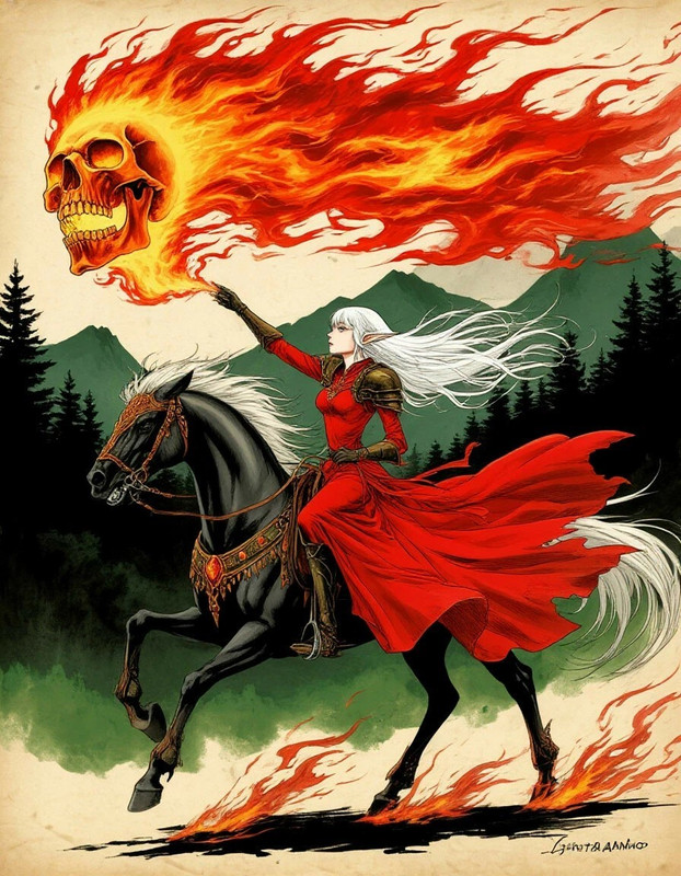 Руки Микаэлы сами собой сложились в привычные жесты. Повинуясь воле волшебницы струйки ветра Акши, ветра огня, соединились в большой огненный череп, который с жутким оскалом быстро двинулся вперёд. Череп парил, почти касаясь своей огненной челюстью земли, крысы мгновенно исчезали в его голодной пасти, за ним оставалась лишь полоса выжженной земли. Микаэла освободила свой клинок из ножен и с кличем «Каледор!» пришпорила коня.