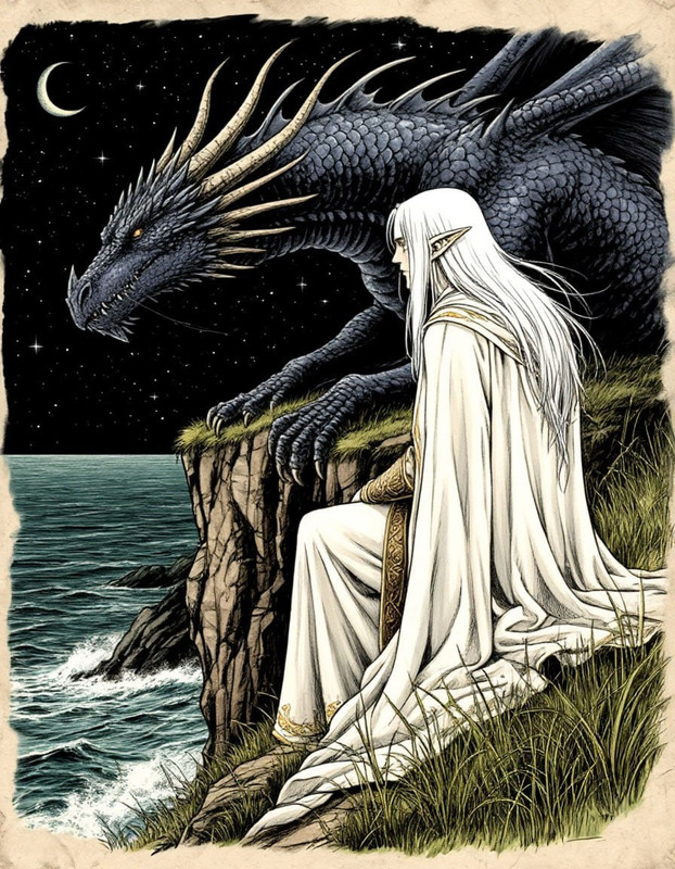 Море нежно ласкало скалы, небо было усыпано тысячами звёзд. Звезды складывались в сложные узоры и освещали небо и землю тусклым, мягким светом. Светлая фигура на отвесном утёсе задумчиво смотрела в даль.