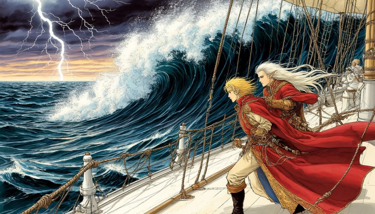 Огромная серая волна поднялась над кораблем и практически закрыла собой небо. Массы воды падали на корабль и неминуемо грозили отправить его прямиком к Матлаану. Две фигурки на корме пытались развернуть корабль по направлению волны. От некогда белоснежных парусов остались порванные несколько раз тряпки. Море Ужаса полностью оправдывало своё название. Начавшаяся вскоре после выхода из Тор Элазора буря длилась уже три недели. Её не могли унять ни молитвы морскому богу, ни заклинания магов. И если сначала мастерство эльфийских мореходов позволяло держаться вместе, то теперь от всей флотилии остались три корабля.