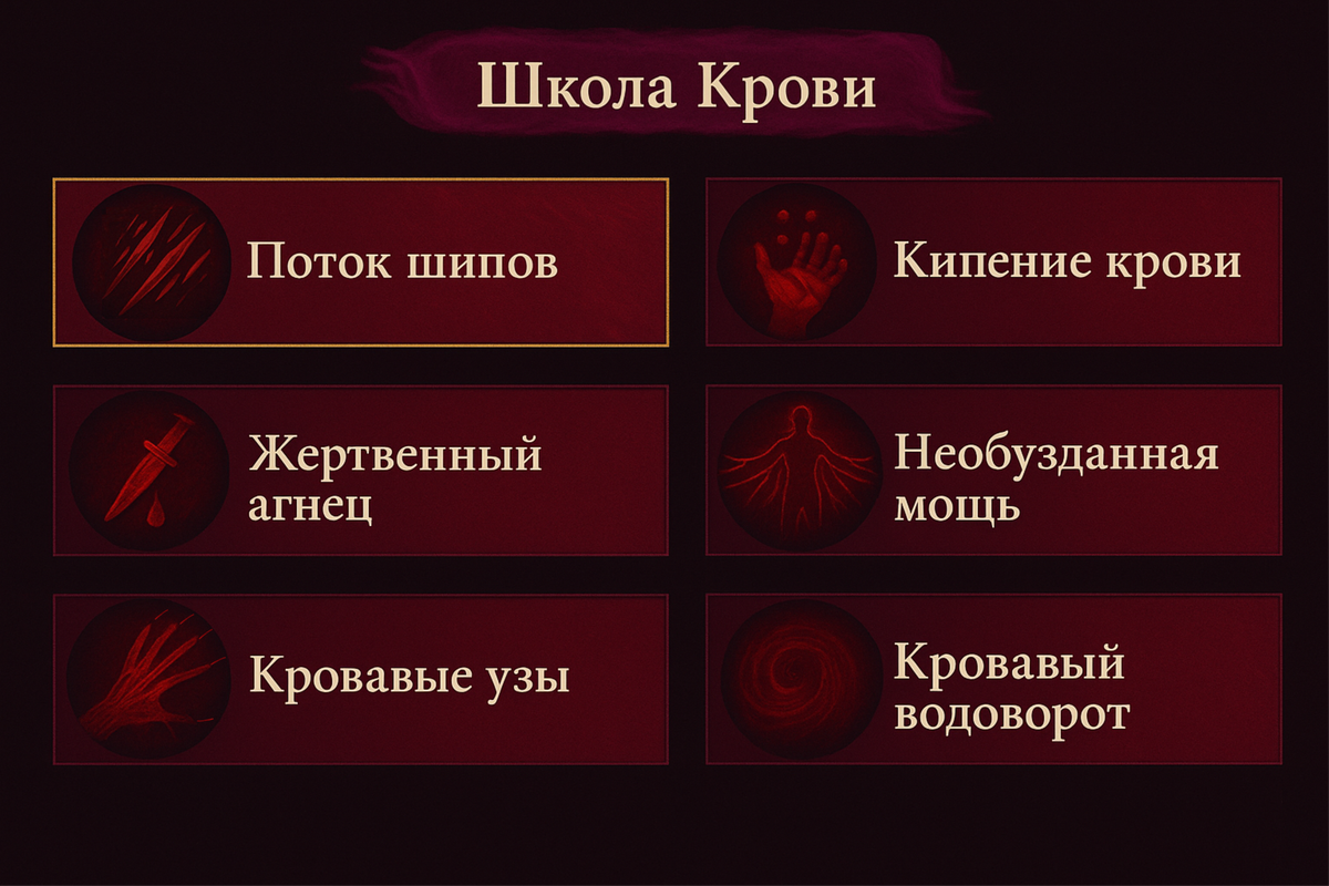Раскрытый потенциал: За каждое примененное заклинание магии крови сила заклинаний увеличивается на 7%. Эффект держится 35 секунд, затем спадает до 0.