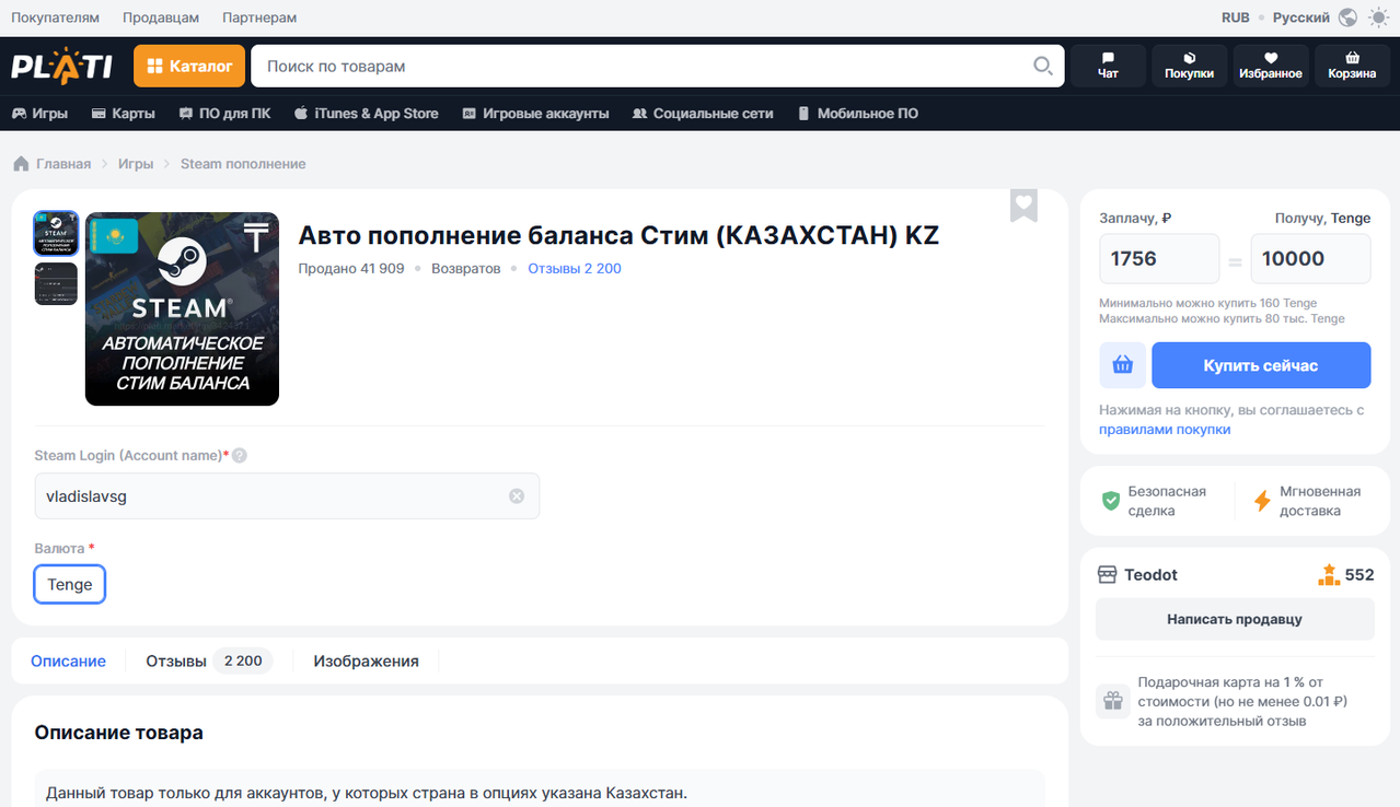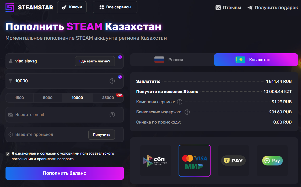Ondiris, буду признателен, если поделитесь скриншотом — во сколько станет зачисление 10 000 тенге на КЗ аккаунт vladislavsg (при условии оплатой российской картой МИР, но необязательно) — тогда добавлю в список.