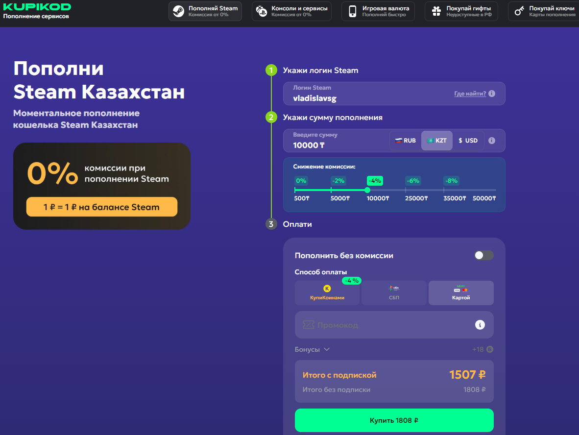 Итого для зачисления 10 000 тенге нужно заплатить 1 808 рублей.